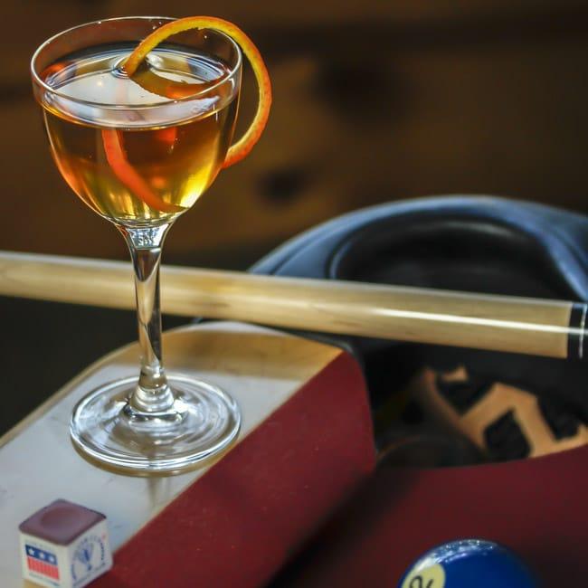 Start by dropping four dashes of orange bitters on top of the brown sugar cube, and muddle with orange peel. Then, add one ounce each of Rye Whiskey and Apple Brandy, stir with ice and serve with an orange peel garnish.